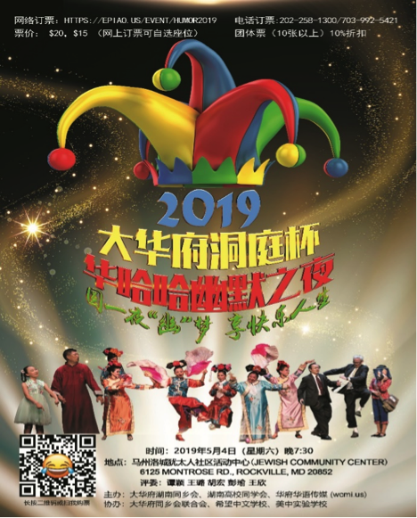 由大华府湖南同乡会、湖南高校同学会及华府华语传媒 (WCMI.US)联合主办,大华府同乡会联合会、希望中文学校和美中实验学校共同协办的大华府幽默专场晚会,定于2019年5月4日, 周六晚 7:30 在马州洛城犹太人社区中心(Jewish Community Center), 6125 Montrose Rd., Rockville, MD 20852举办,座位有限,请从速订票。