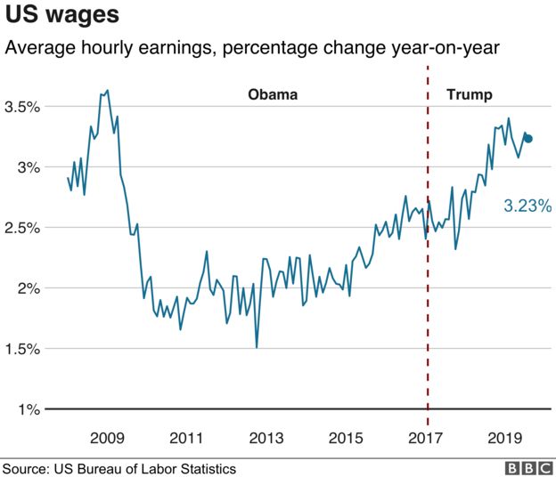 川普2017年上任后,立即兑现其竞选承诺,大刀阔斧地减税和裁减烦冗的官方文件,取消过度的政府管控, 比如在不影响环境保护的前提下,取消对美国近海石油开采的限制, 以减少对中东石油的依赖。还有就是与许多相关国家重新商讨贸易协定, 以堵住美国被占便宜的漏洞。这一系列措施,导致了美国经济的持续发展,道琼斯指数、失业率和个人薪资, 都在持续改善中, 请看下面的图片: