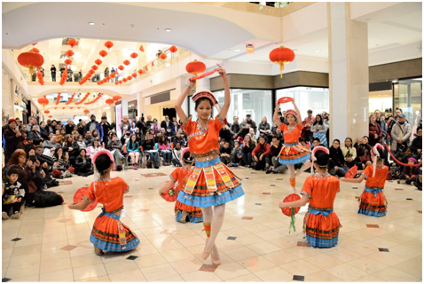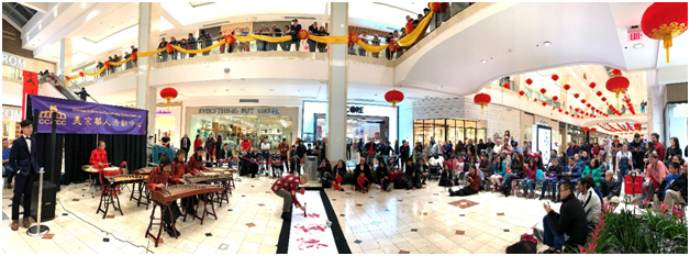 在本地知名的Westfield Montgomery Mall中庭裡,早於1月5日由CCACC在Nordstorm百貨公司前面的中庭二樓,布置好金黃絲帶,掛滿紅色大燈籠,並從二樓高垂下來一幅巨型對聯「吉祥如意、歲歲平安」,再由Montgomery Mall 沿著一樓寬敞的走廊懸掛五排小紅燈。這一片張燈結彩,使整個商場充滿了喜慶氣氛。