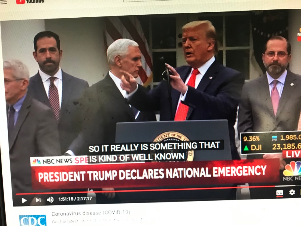 美国东部时间3月13日下午3:30 分, 美国总统川普在白宫南草坪宣布,为抗击新冠病毒, 全美进入紧急状态。这距离世界卫生组织正式宣布新冠病毒灾难已进入全球大流行传染之态仅有一天之隔。