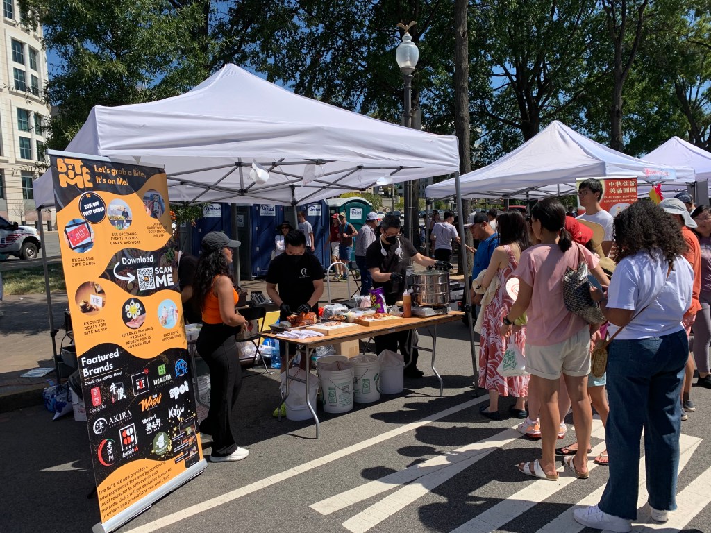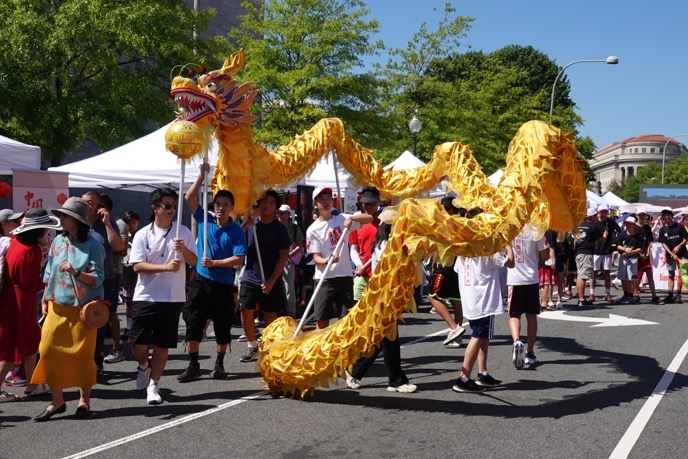 除了传统艺术以外,能与之分庭抗礼的自然是让人垂涎欲滴的中华美食了:现场切片烤鸭,一张薄饼裹上点鸭肉,葱丝和黄瓜,尽管价格不便宜,但单就是那精湛的烤鸭切片技术就足以吸引了不少人;95华氏度的高温天气竟然也没挡住那一串串裹着红辣椒的羊肉串热卖;夏季热卖饮品红糖水果冰粉成为了众多中外顾客的最爱…听着传统的中国音乐,欣赏着一旁的舞龙表演,一组组身着旗袍的女士从身边袅袅走过,你会觉得仿佛置身于中国过年的庙会里,似乎又回到了中国的大街小巷中。