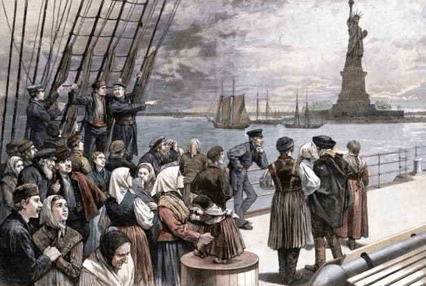 亚当斯先生在读诗时, 也完全忘记了, 在自由女神像背后的不远处, 是爱丽丝岛, 这是一个移民处理中心,专门处理从欧洲来的移民。女神像1886年落成, 爱丽丝岛移民中心1892年就开张了,就是说当欧洲移民乘船经过女神像后, 很快就要上爱丽丝岛接受检查。
